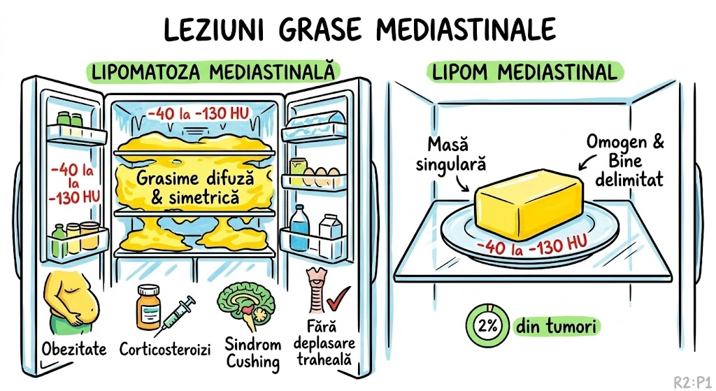 🥊 Ringul Comparatiilor: Lipomul si hipertrofia lipomatoasa sunt ca doua variante de grasime in bucatarie — untul (solid, encapsulat, predictibil) vs. uleiul varsat pe masa (neincapsulat, se imprastie, imprevizibil). Ambele apar inalt pe T1. Dar untul e un neoplasm adevarat (benign), pe cand uleiul varsat nu e nici macar tumora — e doar depunere excesiva de grasime in sept. Semnul distinctiv: uleiul se imprastie in jurul fossa ovalis fara sa o acopere — ca si cum fossa ar fi hidrofoba.