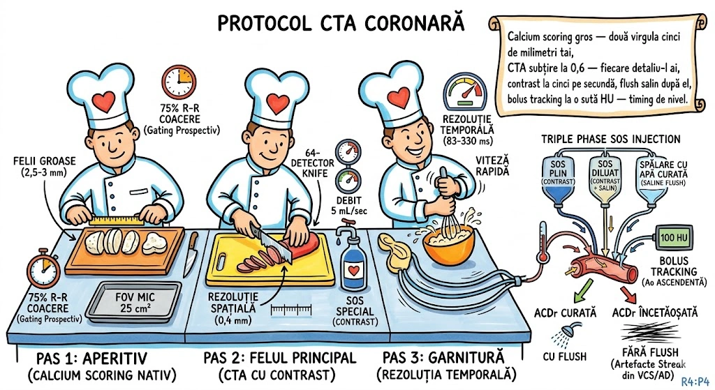 Flush-ul salin dupa contrast e ca stergerea pensulei intre culori cand pictezi: daca nu o faci, culoarea anterioara (contrastul dens din VCS) se amesteca cu imaginea urmatoare (coronara dreapta) si obtii un artefact streak in loc de o coronara curata. Fiecare pas din protocol exista nu pentru ca e elegant, ci pentru ca o singura omisiune strica intreaga imagine.
