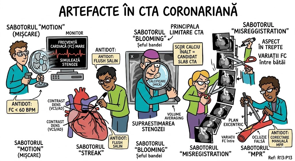 Placa calcificata care cauzeaza blooming vs. placa moale invizibila care cauzeaza SCA e ca diferenta dintre un hot care face zgomot la intrare (il vezi pe camera dar pari mai amenintator decat e) vs. un hot silentios care intra nedetectat (nu-l vezi, dar e cel care fura). Calcificata = vizibila dar supraestimata. Moale = invizibila dar letala.