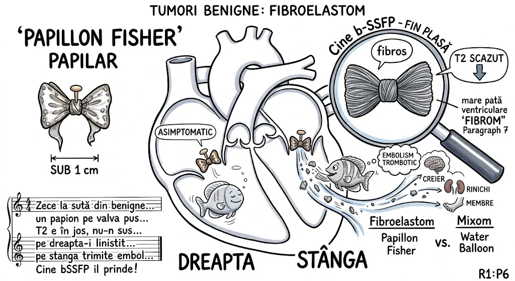 Cuvantul-cheie "papilar" trimite instant la imaginea unui papion mic — asa arata fibroelastomul: o formatiune mica, eleganta, prinsa cu un ac (pedicelul scurt) de valva cardiaca. Sub 1 cm — aproape invizibil cu ochiul liber. "Fibroelastom" iti spune continutul: fibros. Fibros inseamna T2 scazut — la fel ca fibromul din peretele ventricular (p7). Regula mnemonica: tot ce contine multa fibroza are T2 scazut. Papionul sta linistit pe partea dreapta — asimptomatic. Dar daca a ajuns pe valva din stanga → risc de embolism trombotic → papionul trimite fragmente in circulatia sistemica. Cum il gasesti? Cine b-SSFP — cel mai bun pentru mase mici atasate de valve.