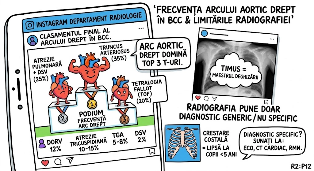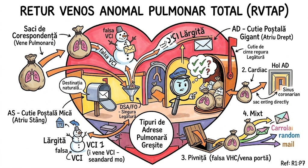 🥊 Ringul Comparatiilor: PAPVD e ca o livrare de colete unde 1-2 pachete din 20 ajung la vecin in loc de tine — de obicei nu observi lipsa. TAPVD e ca atunci cand intregul colet de la comanda online ajunge la o alta adresa si singura solutie e sa ai o cheie de la usa vecinului (defect septal). Sindromul scimitar (p9) e un PAPVD special — include scrisoarea gresita (vena scimitar) plus un curier suplimentar de la alt oras (artera sistemica din aorta).