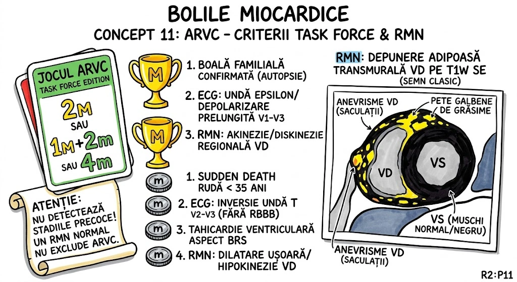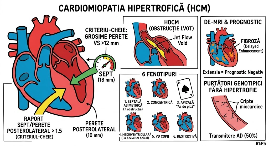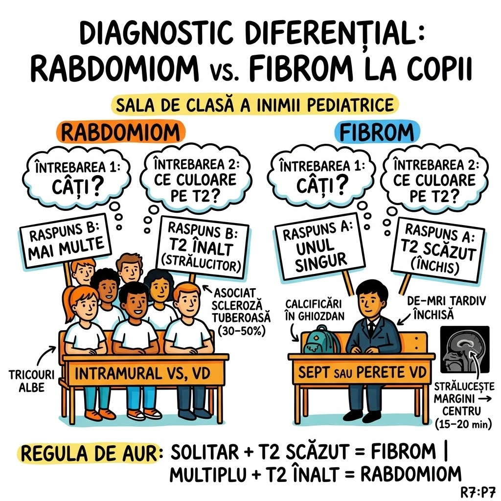 🥊 Ringul Comparatiilor: Rabdomiomul vs. fibromul la copii e ca doua echipe de fotbal din curtea scolii: echipa in alb (rabdomiom — T2 inalt, multiplu, asociat scleroaza tuberoasa) vs. jucatorul singuratic in negru (fibromul — T2 scazut, solitar, calcificari). Ambii joaca pe acelasi teren (miocardul pediatric). Dar niciodata nu le confunzi daca le stii culorile tricourilor si numarul de jucatori.