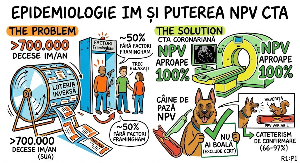 PPV de 66-97% vs. NPV de 92-100% e ca diferenta dintre un test de sarcina si un test de virgitate: testul negativ e aproape sigur corect (NPV), dar testul pozitiv necesita confirmare (PPV variabil). In practica: CTA negativa = pacientul pleaca acasa linistit. CTA pozitiva = pacientul merge la cateterism pentru verdictul final.
