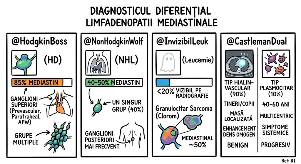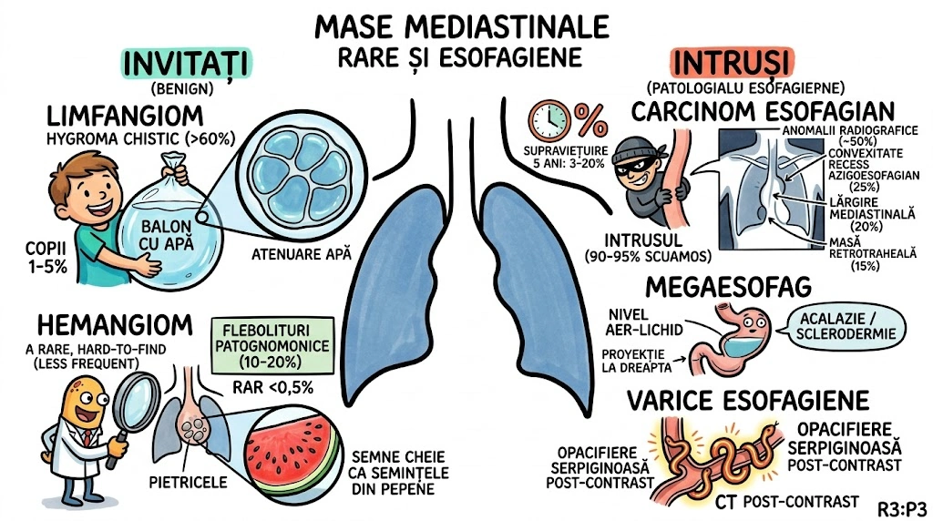 🥊 Ringul Comparatiilor: Angiosarcomul in AD vs. mixomul in AS — sunt vecinii de pe aceeasi strada dar din lumi complet diferite. Mixomul e locatarul pasnic din AS: pedicel ingust, omogen, T2 inalt, enhancement uniform. Angiosarcomul e ocupantul agresiv din AD: baza larga, heterogen, necroze, hemoragie, infiltratie pericardica, extensie extracardiaca. Lateralizarea (AS vs. AD) plus semnele de agresivitate separa instant benignu de malign in majoritatea cazurilor.