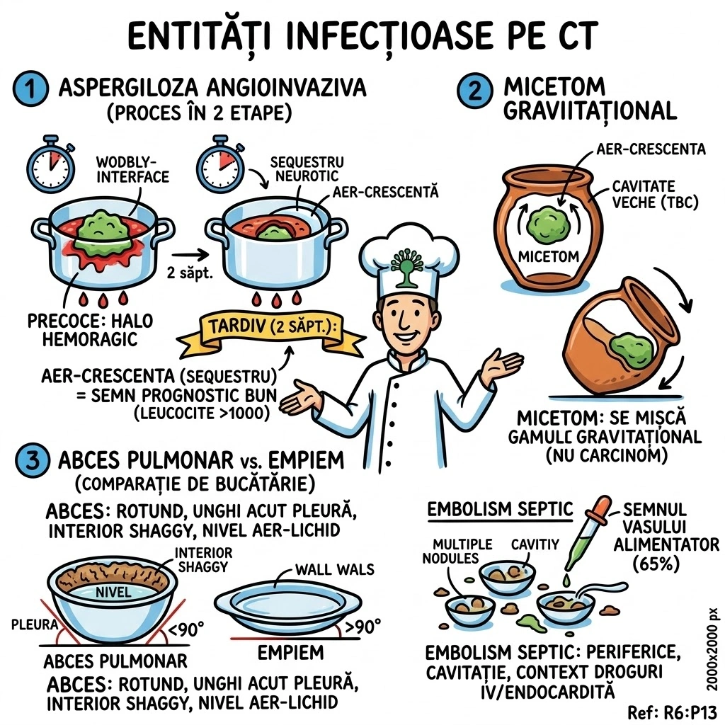 Pivnita Plamanului, raftul Lobilor Inferiori: un borcan rotund, perfect sigilat, sta acolo de la constructia casei (gestatie). Jumatate din borcane contin lichid clar (0-20 HU) — nu deranjeaza pe nimeni. Dar cealalta jumatate contine un continut dens, proteic, cu aspect de gem inchis (40-80 HU) — radiologul se uita si zice: "Pare masa solida." Nu e. E borcan cu gem vechi. In 75% din cazuri, borcanul se infecteaza: se umfla, capacul sare partial (aer intrachistic), apare un nivel apa-gem (nivel aer-lichid). Peretele borcanului e atat de subtire incat pe CT e invizibil — ca un Tupperware medical din gestatie, cu eticheta lipsa si continut surpriza.