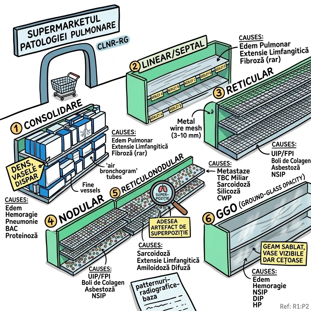 Cosul de cumparaturi patologic — cinci rafturi la supermarketul alveolar. Raftul A (Apa): edem hidrostatic, SDRA, edem neurogenic, edem post-reexpansie. Raftul S (Sange): hemoragie pulmonara, contuzie, infarct, vasculite (Wegener, Churg-Strauss), LES, Goodpasture, hemosideroza idiopatica. Raftul P (Puroi): pneumonie bacteriana, TBC, fungica, virala, PCP, atipica. Raftul C (Celule): carcinom bronhiolo-alveolar, limfom, pneumonie eozinofilica, BOOP, pneumonita de hipersensibilitate, PII. Raftul A2 (Alte): proteinoza alveolara (lipoproteina), pneumonie lipoidica (lipide). Acronimul cosului: ASPCA — Asociatia Substantelor ce Populeaza Compliant Alveolele.