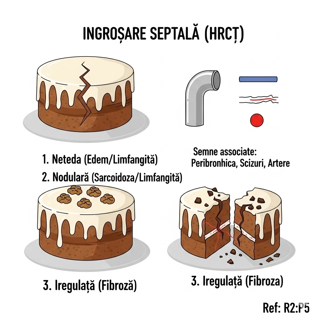Ce Memoram: Cinci modele de consolidare difuza: (1) Perihilar „bat-wing" = edem (cel mai tipic); (2) Periferic subpleural = boli cronice (eozinofilica clasic, BOOP); (3) Difuz in pete = orice pneumonie, edem, SDRA; (4) Noduli aerospatiali difuzi = diseminare endobronsica; (5) Consolidare omogena difuza = edem, SDRA, hemoragie.