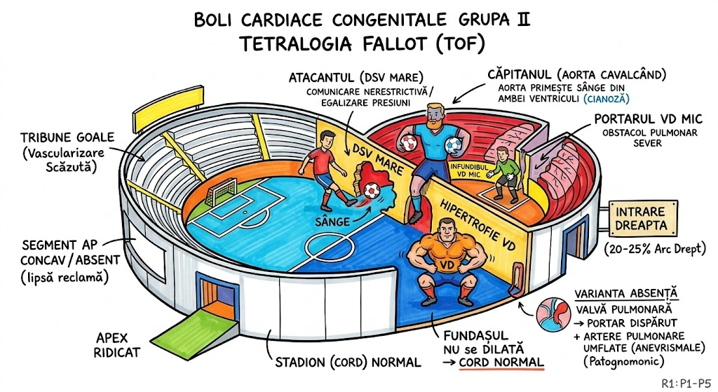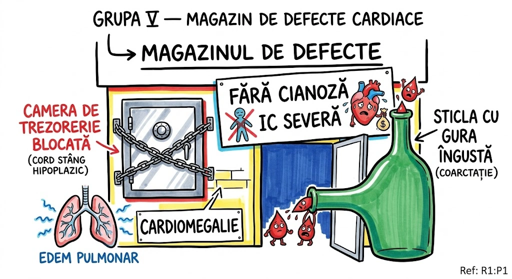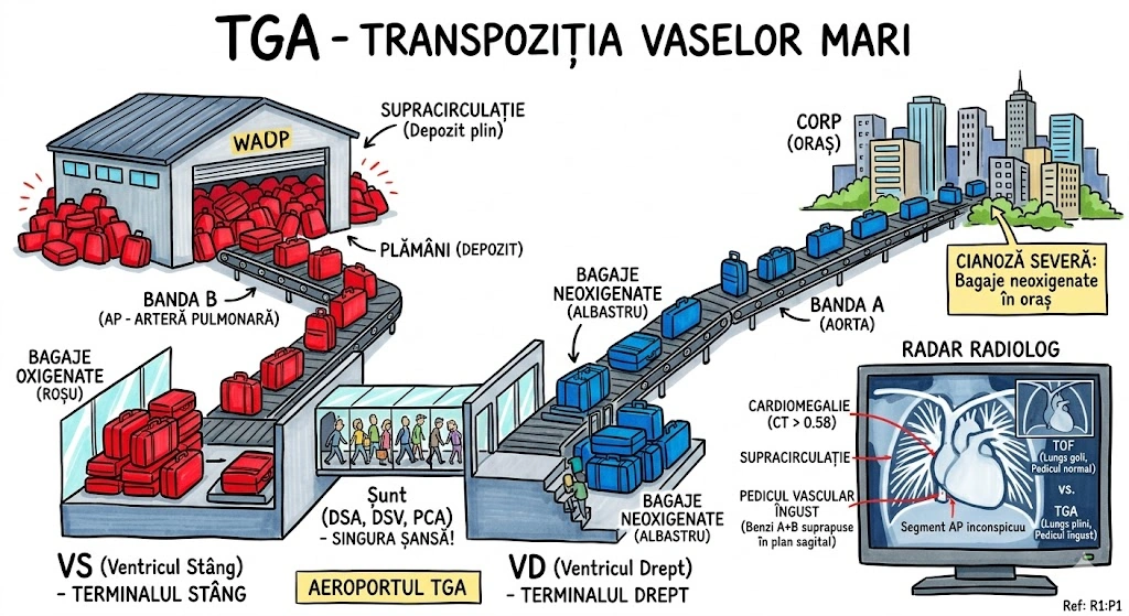 CHD acianogena cu sunt Stg→Dr vs. cianogena cu AP scazuta e ca diferenta dintre o cada care se umple prea repede (supraincarcare volum pulmonar — Qp/Qs >1) vs. o cada care nu primeste destula apa (flux pulmonar redus — VD hipertrofiat, cianoza). Ambele sunt probleme de debit — una in exces, cealalta in deficit. TGA si truncusul sunt la mijloc: apa ajunge, dar e amestecata cu apa murdara.