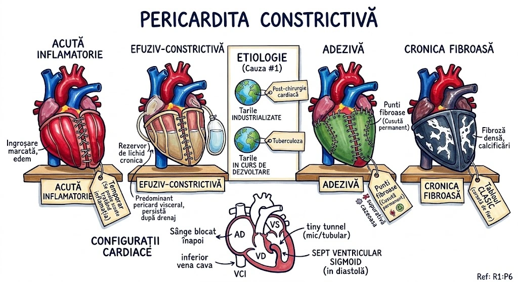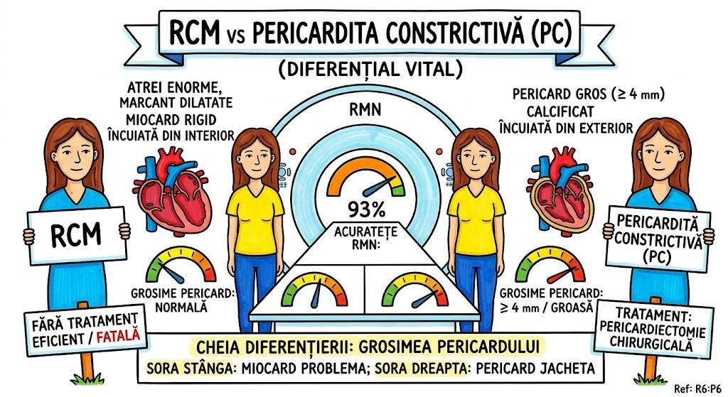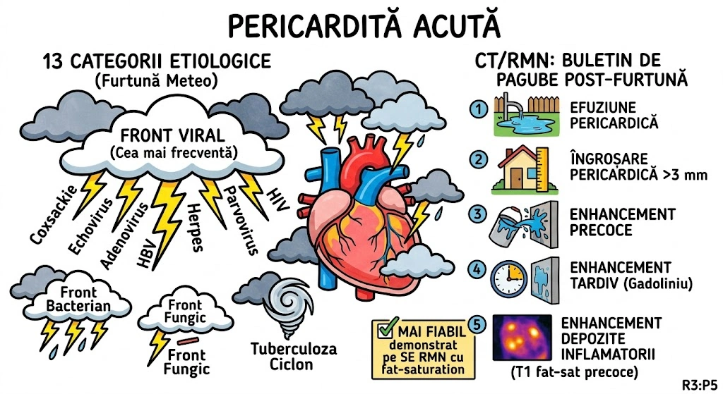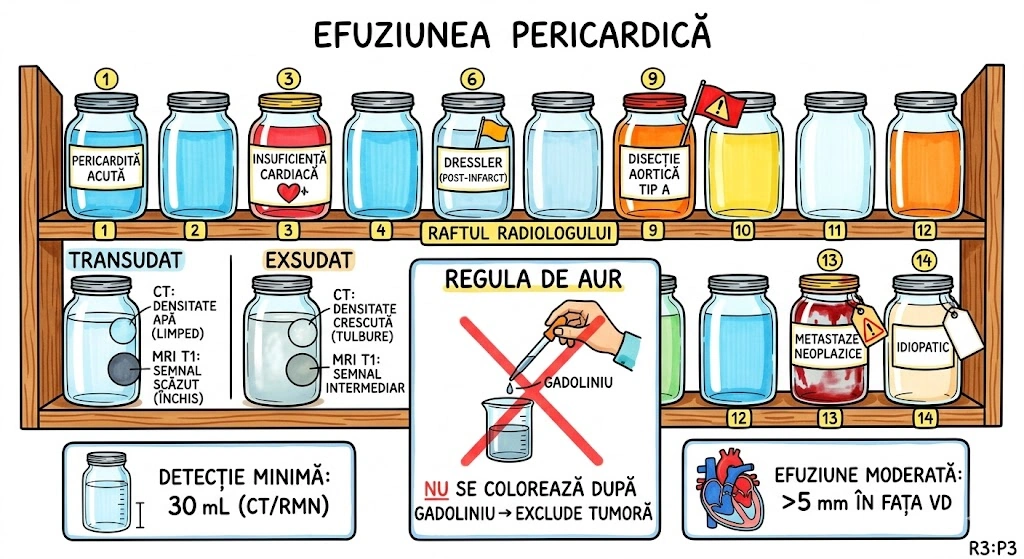 🥊 Ringul Comparatiilor: Tabelul diagnostic pericardic e similar cu un meniu de restaurant in care toate preparatele arata la fel la prima vedere, dar ingredientele difera radical: pericardita acuta si constrictiva au ambele pericard gros, dar una enhanceaza precoce si cealalta tardiv. Efuziunea simpla si hemopericardium au ambele lichid, dar densitatea CT le separa (<20 vs. >40-45 UH). Chistul si tumora arata identic pe T1 daca chistul e proteinos — dar gadoliniul e chelnerul care stie ce e in farfurie.