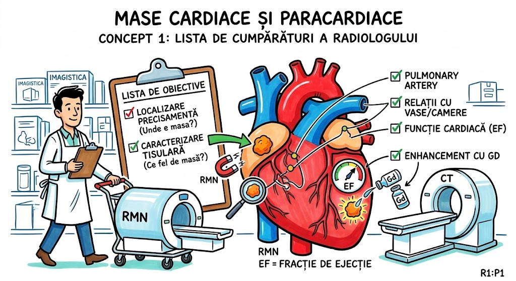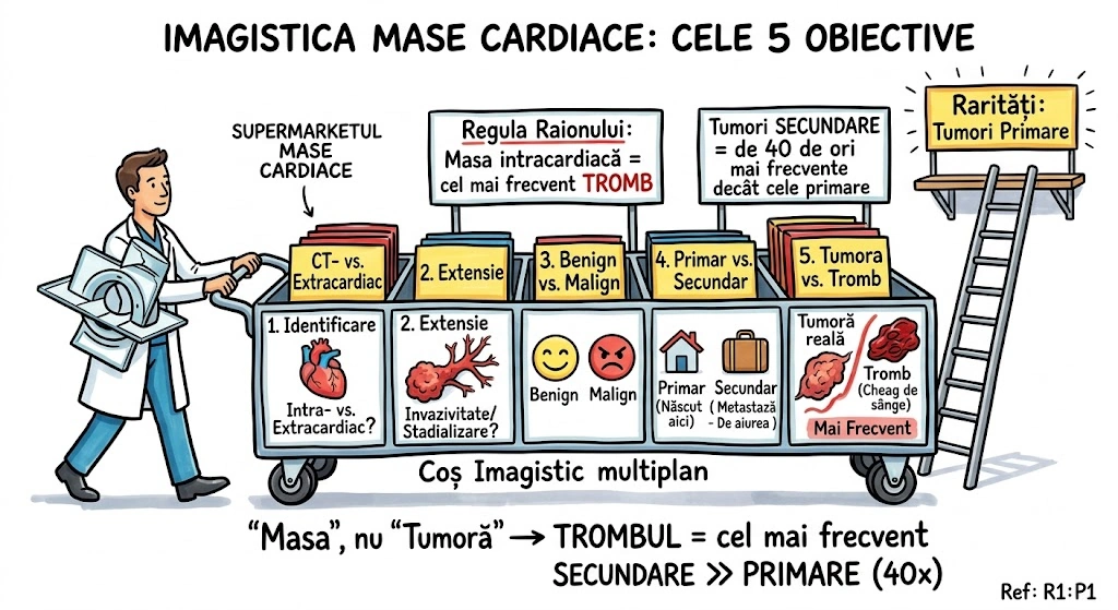 Imagineaza-ti ca intri intr-un supermarket cu o lista de cumparaturi de exact 5 produse — fiecare produs corespunde unui obiectiv imagistic. Raftul 1: "Este masa intracardiaca sau extracardiaca?" — identificarea. Raftul 2: "Cat de departe s-a extins si invadeaza ceva?" — extensia. Raftul 3: "E ceva bun sau ceva rau?" — benign vs. malign. Raftul 4: "A aparut aici prima data sau a venit de aiurea?" — primar vs. secundar. Raftul 5: "E o tumora reala sau doar un cheag de sange?" — tumora vs. tromb. Lista trebuie completata la fiecare evaluare. Si — la casa de marcat vei descoperi ca 97% din mase nu sunt tumori primare. Sunt fie trombi, fie metastaze. Tumorile primare cardiace sunt raritati: cele secundare le depasesc de 40 de ori.