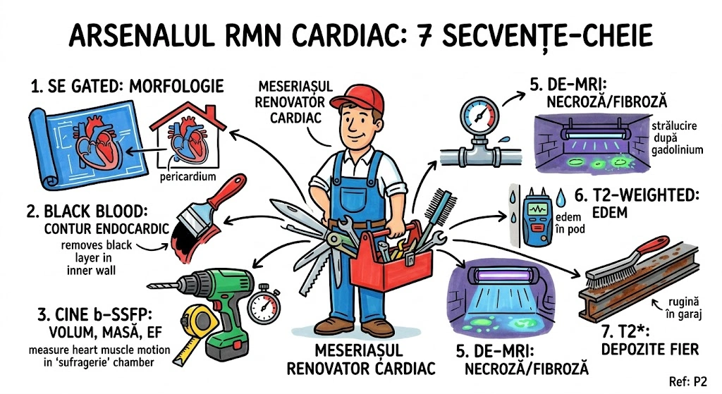 Bucatarie profesionala cu sapte ustensile, fiecare destinata unui singur tip de preparat. Ustensila 1 (T1 SE): cutitul de precizie — taie anatomia: localizare, morfologie. Ustensila 2 (T2 SE): termometrul — masoara "temperatura" tumorii fata de miocard: tumori inalt, miocard scazut. Ustensila 3 (T1 + Gd): lampa UV — arata petele invizibile (vascularizatia tumorala si marginile). Ustensila 4 (T1 fat-sat + Gd): situla care separa grasimea de rest — lipoamele dispar cand cerni. Ustensila 5 (Cine GRE/b-SSFP): camera video de actiune — filmeaza miscarea in timp real. Ustensila 6 (DE-MRI): fotograful de arta care vine dupa 15-20 de minute — prinde fibroamele si trombii. Ustensila 7 (sagitale/coronale): oglinda auxiliara. Regula fundamentala: pe SE, sangele e negru; pe Cine, sangele e alb.