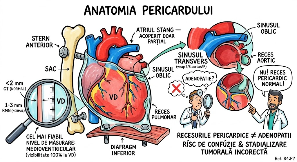 La petrecerea de dezvoltare embrionara, cineva a uitat doua tipuri de baloane lipite de colturile inimii. Balonul sigilat (chistul) sta in 90% din cazuri in unghiurile cardiofrenice — 70% in coltul drept, 20% in stang. Nu are nicio legatura cu interiorul pericardului. Balonul cu robinet (diverticulul) comunica ingust cu cavitatea si poate creste sau scadea dupa nivelul lichidului. 60% din baloane contin apa limpede (T1 inchis, T2 deschis). 40% — atentie — contin lichid proteinos sau sangvinolent, si pe T1 stralucesc. Un radiolog neatent vede ceva stralucitor pe T1 in unghi cardiofrenic si striga "tumora!" Dar baloanele nu se coloreaza dupa gadoliniu. Tumorile — da. Acesta e testul. "Ai pus gadoliniu?" "Da." "Se coloreaza?" "Nu." "E balon, nu tumora. Mergi acasa."