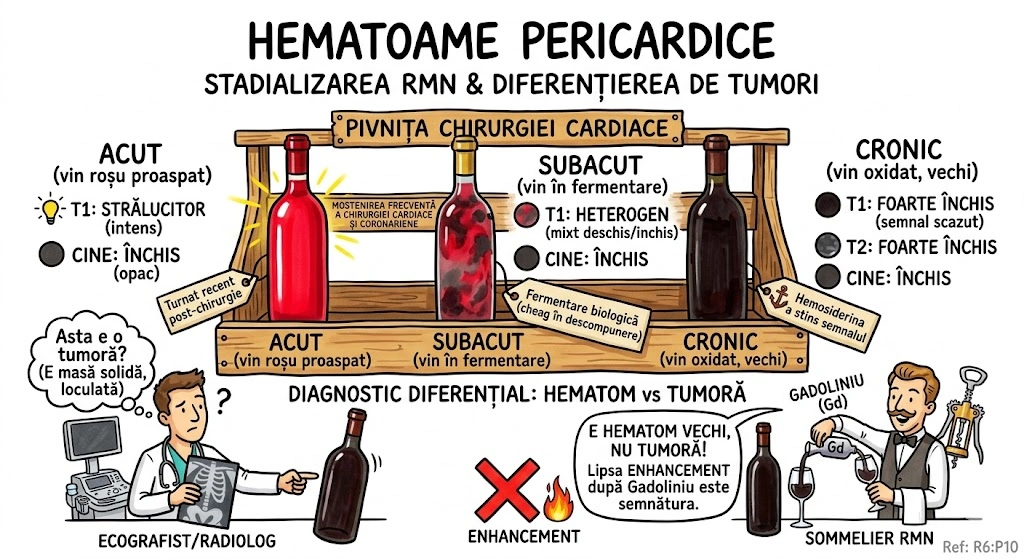 Pivnita Chirurgiei Cardiace: trei sticle de vin pericardic, fiecare cu eticheta de varsta. Sticla acuta (rosie, stralucitoare pe T1, opaca pe cine): "Tocmai turnata — chirurgia a fost saptamana trecuta." Sticla subacuta (cu sediment haotic pe T1 — zone deschise si inchise): "Cheagul e in plina descompunere — fermentare biologica." Sticla cronica (inchisa pe tot — T1, T2, cine): "Hemosiderina a supt tot semnalul — e stinsa ca un vin de 30 de ani uitat in pivnita." Un ecografist vede sticla cronica si spune: "Asta e o tumora." Sommelierul RMN pune gadoliniu: nimic nu se coloreaza. "E hematom vechi, nu tumora. Inapoi in pivnita." Morala: orice masa pericardica post-chirurgie cardiaca e hematom pana la proba contrarie.