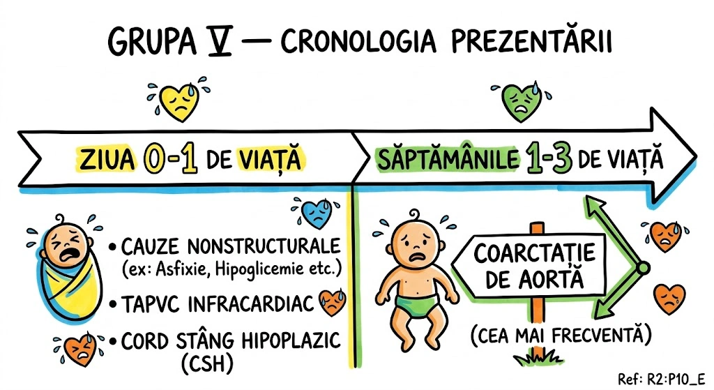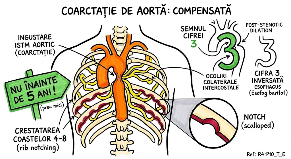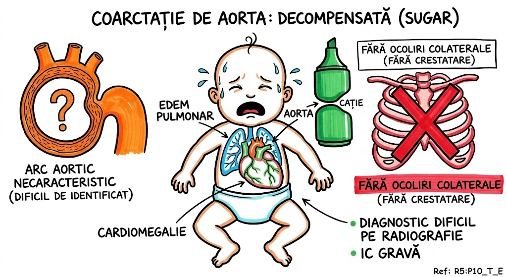 Coarctatia pre-ductala vs. post-ductala e ca diferenta dintre un furtun strans pe toata lungimea (copilul — furtunul inca nu si-a dezvoltat ramificatii de compensare) vs. un furtun strans intr-un singur punct dar cu zeci de furtunase alternative crescute in timp (adultul — colateralele intercostale). Prima e urgenta, a doua e descoperita la controlul de rutina cand se observa hipertensiune la brate si puls diminuat la picioare.