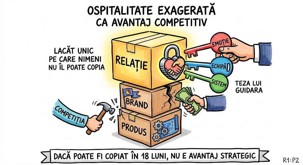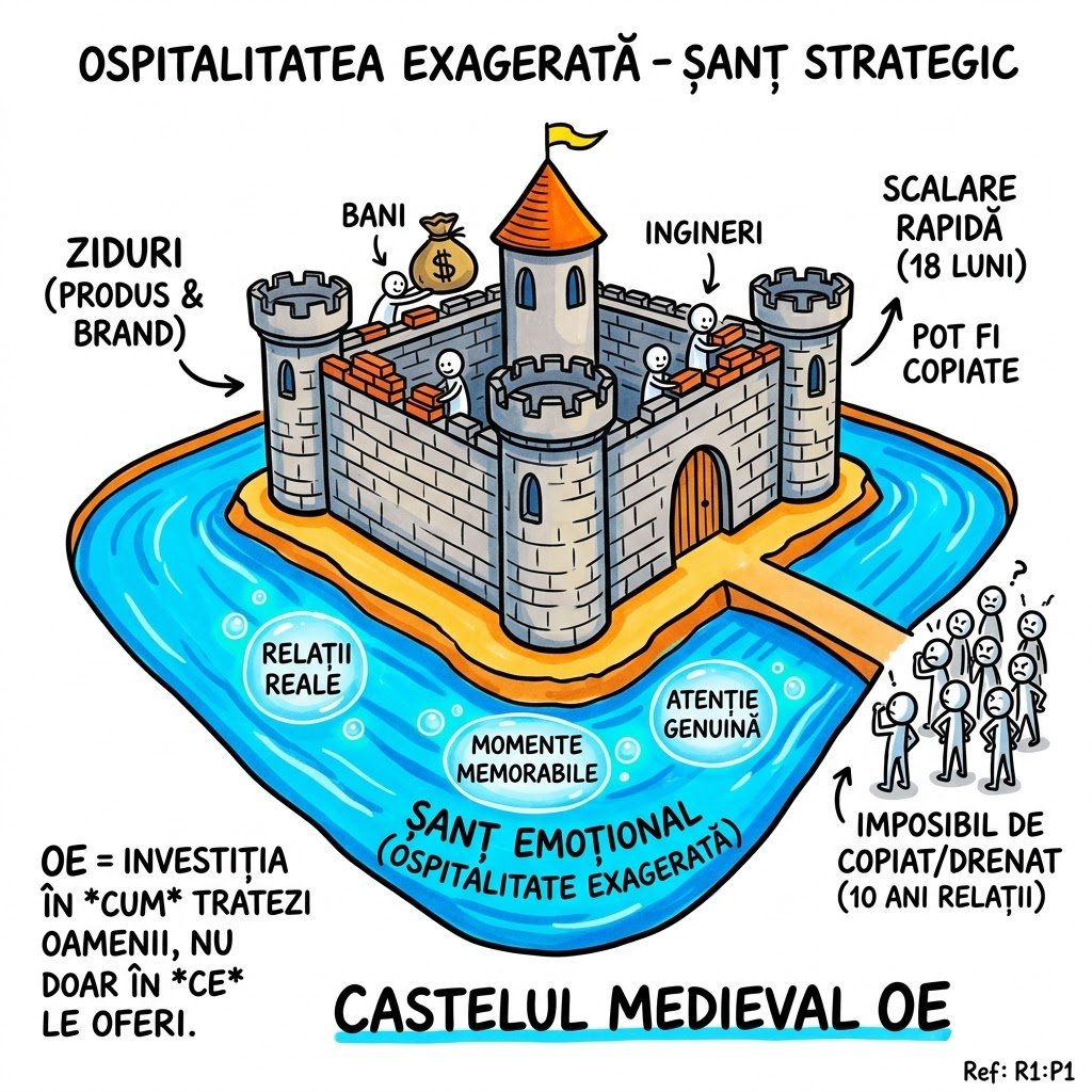 Vizualizează un castel medieval: zidurile și turnurile = produsul și brandul (pot fi scalate de oricine cu suficienți bani și ingineri). Șanțul de apă din jurul castelului = ospitalitatea exagerată — creată din relații reale, momente memorabile, atenție genuină. O armată de competitori poate scala zidul în 18 luni (copiază produsul, copiază brandul). Dar nu poate drena șanțul — nu poți copia 10 ani de relații și amintiri comune. Guidara a ales să investească mai mult în șanț decât în ziduri — și a ajuns numărul 1 în lume.