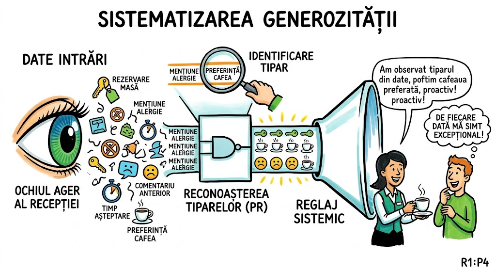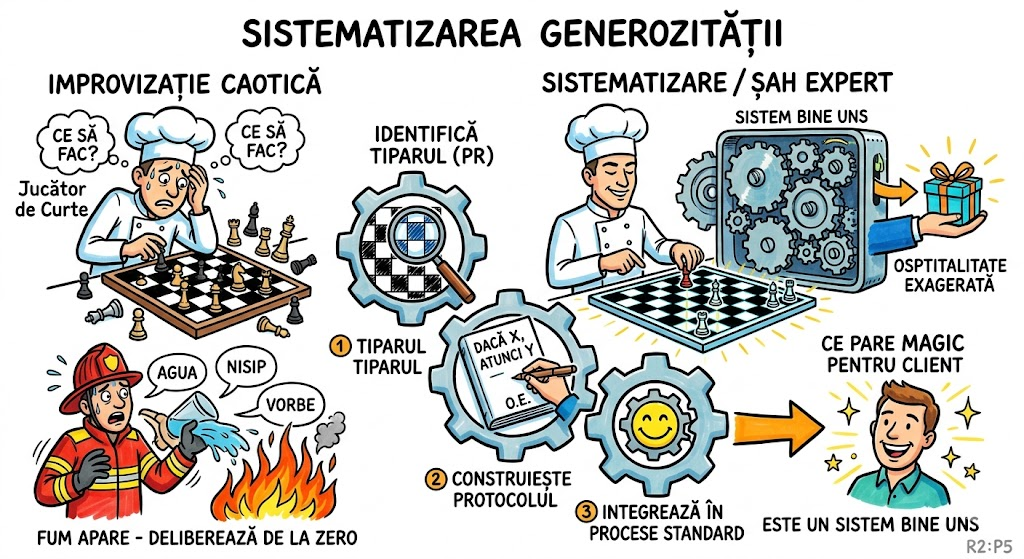 Ce memorăm: Generozitatea excepțională nu trebuie să fie spontană și aleatorie — poate fi sistematizată. Etapele: (1) identifică situația recurentă (PR), (2) construiește protocolul de răspuns, (3) integrează-l în procesele standard. Efectul: ceea ce pare magic pentru client este, de fapt, un sistem bine uns.