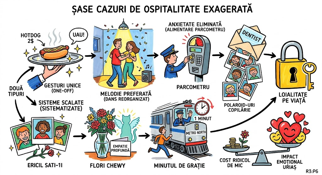 (Citește asta dacă explicațiile de mai sus nu au fost de ajuns sau vrei să aprofundezi.) Guidara prezintă șase exemple concrete de Ospitalitate Exagerată, împărțite în două categorii funcționale. Categoria gesturilor unice (one-off): (1) Un client dorea un hotdog de la un vânzător stradal după revenirea în SUA — echipa i-a procurat unul și i l-a servit pe un platou de argint. (2) Un cuplu care și-a anulat nunta și sărbătorea cină la restaurant a primit, surpriză, organizarea unui prim dans cu melodia aleasă inițial pentru nuntă. Categoria sistemelor scalate (sistematizate): (3) Când un client menționa că trebuie să alimenteze un parcometru, un angajat se oferea să o facă în locul său, eliminând o sursă concretă de anxietate. (4) O clinică stomatologică pediatrică a trimis unui pacient de 21 de ani, care nu mai putea veni la control, toate fotografiile Polaroid strânse de-a lungul anilor pe „peretele fără carii”. (5) Compania Chewy (alimente pentru animale de companie) trimite aranjamente florale clienților care anulează abonamentul pe motiv de deces al animalului, un gest de empatie profundă într-un moment dificil. (6) Trenurile Metro North din New York pleacă intenționat cu un minut mai târziu decât ora afișată, oferind călătorilor o șansă suplimentară de a prinde trenul. În toate cele șase cazuri, costul financiar este redus sau neglijabil, iar impactul emoțional este disproporționat de mare.