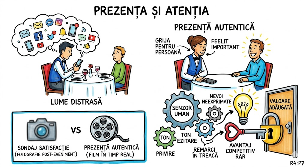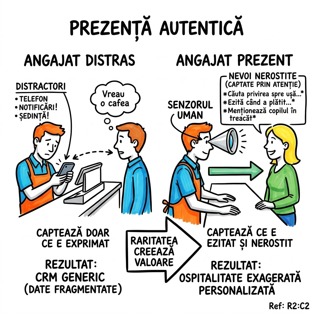 Construiește mental un contrast în două scene. Scena 1: ești la cină cu cineva important și verifici telefonul din 3 în 3 minute — persoana simte că e pe locul doi. Scena 2: pui telefonul cu fața în jos, îl urmărești cu privirea, îl asculți complet — el simte că e singura persoană din sală. Acum scalezi Scena 2 la nivel de business: fiecare angajat cu adevărat prezent în conversația cu clientul devine un senzor uman care detectează informații pe care niciun algoritm de CRM nu le va capta vreodată — tonul, ezitarea, privirea către ușă, remarci în treacăt. Prezența = cel mai ieftin și cel mai puternic instrument de intelligence al companiei tale.