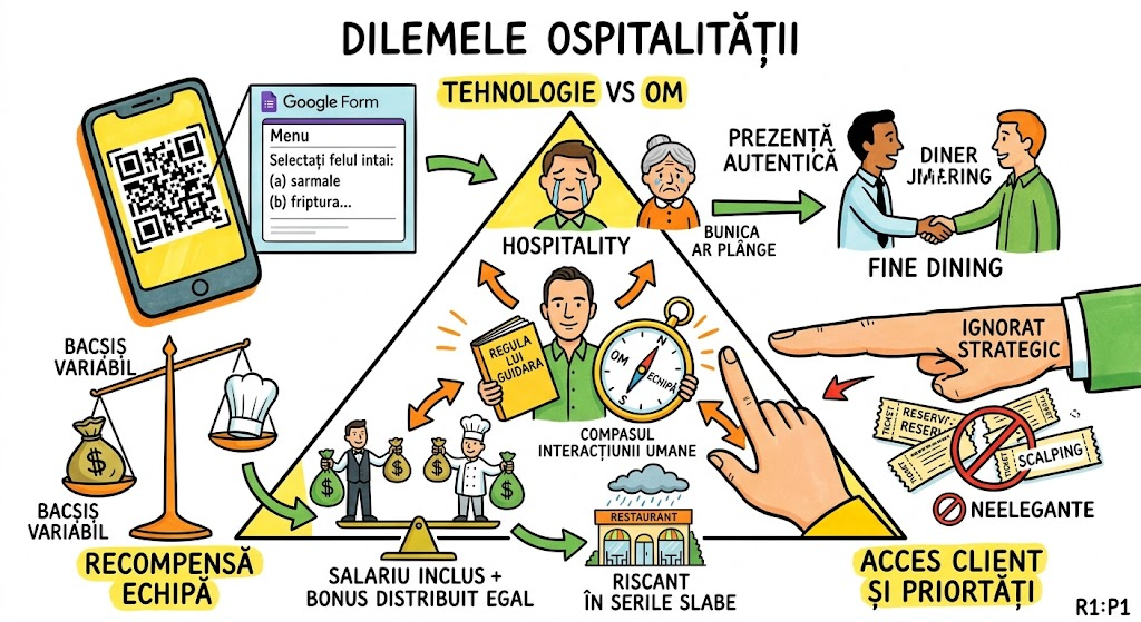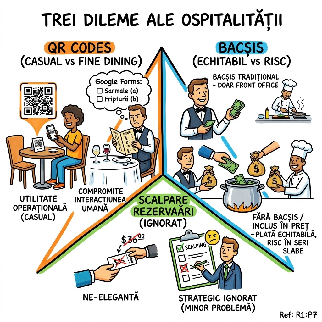 Ce memorăm: Trei dileme ale industriei cu implicații universale — (1) QR codes utile în casual, inutile în fine dining ca substitut de interacțiune umană, (2) eliminarea bacșișului permite plată mai echitabilă a întregii echipe dar expune riscului în serile slabe, (3) scalparea rezervărilor e neelegantă dar o prioritate de ignorat strategic.