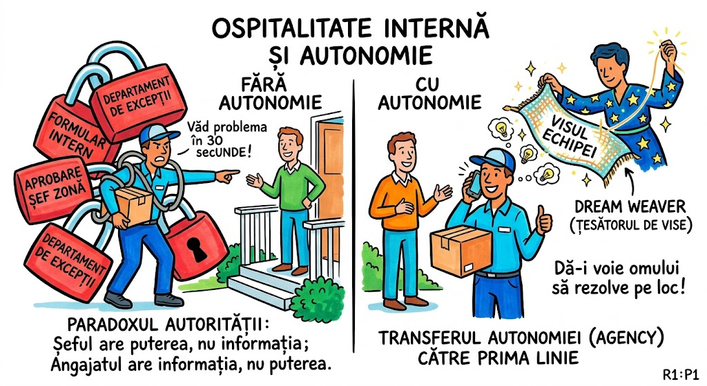 Imaginează-ți o firmă de curierat unde, de fiecare dată când curierul vede că adresa e greșită și poate rezolva în 30 de secunde sunând clientul, trebuie să completeze un formular intern, să aștepte aprobarea șefului de zonă și să trimită o cerere la departamentul de „excepții operaționale”. Clientul așteaptă. Formularul e în procesare. Departamentul de excepții operaționale e la un training despre „orientarea către client”. Între timp, coletul se întoarce la depozit. Asta e EXACT ce se întâmplă în orice companie unde angajații nu au autonomie — și explică de ce clienții tăi sună la concurență pentru probleme pe care angajatul tău le-ar fi rezolvat în 30 de secunde, dacă l-ai fi lăsat.